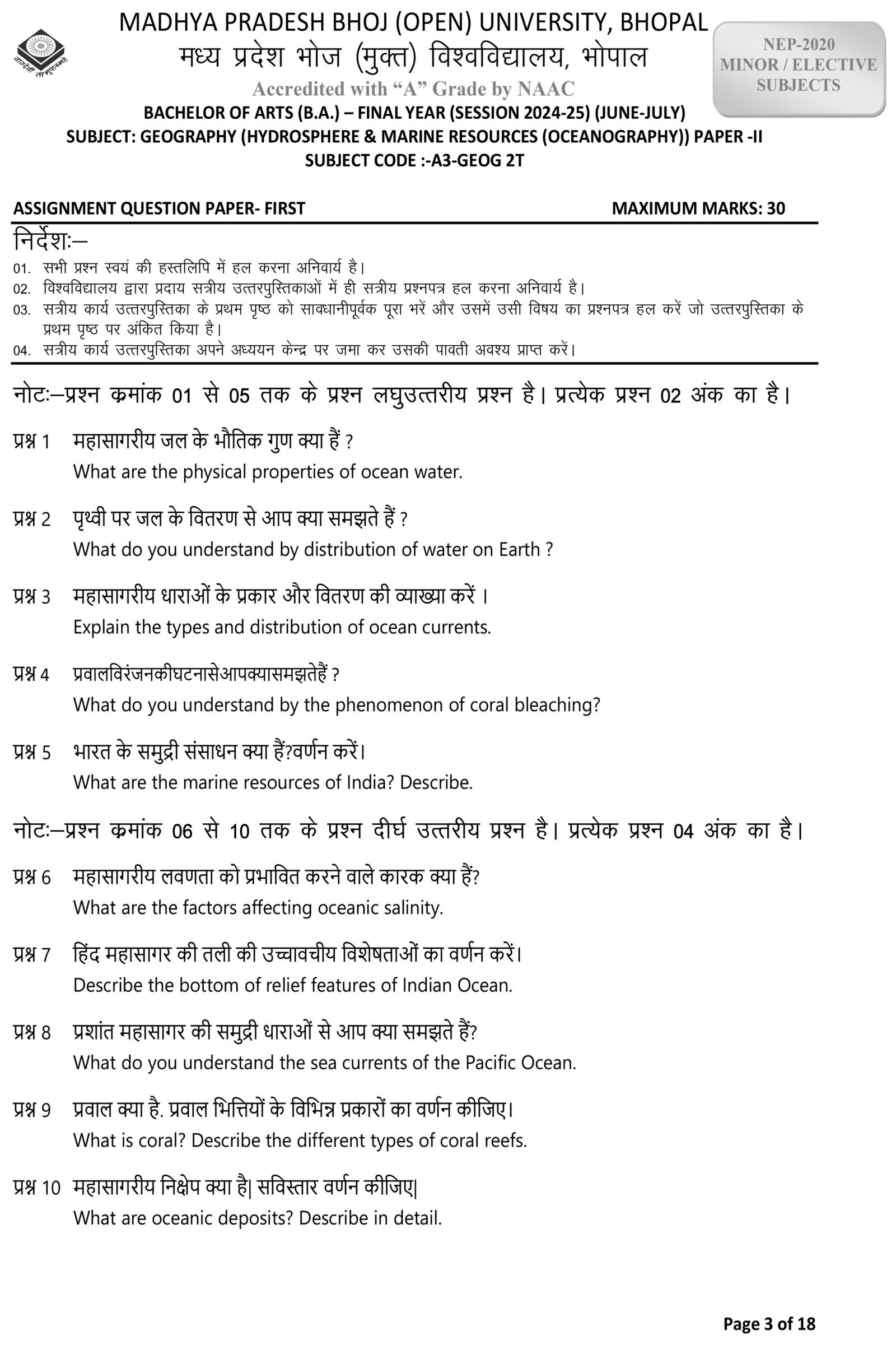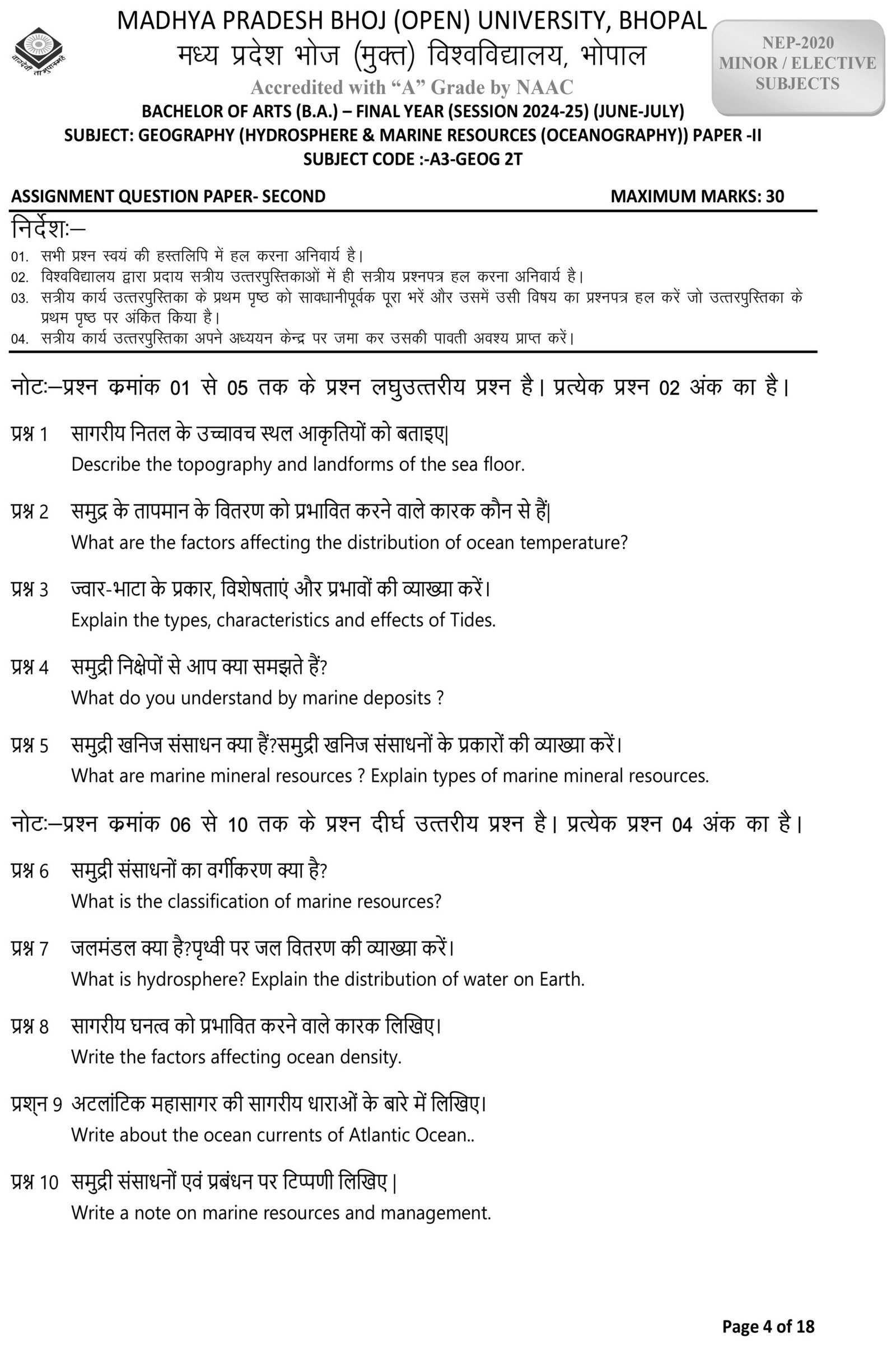 GEOGRAPHY (Hydrosphere & Marine Resources – Oceanography) Paper – II