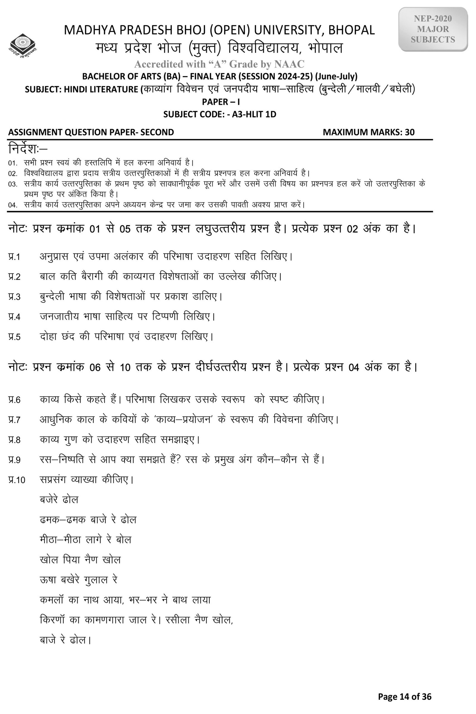SUBJECT: HINDI LITERATURE (Folk Language and Literature – Bundeli / Malvi / Bagheli) (काव्यांग विवेचन एवं जनपदीय भाषा-साहित्य (बुन्देली / मालवी/ बघेली)