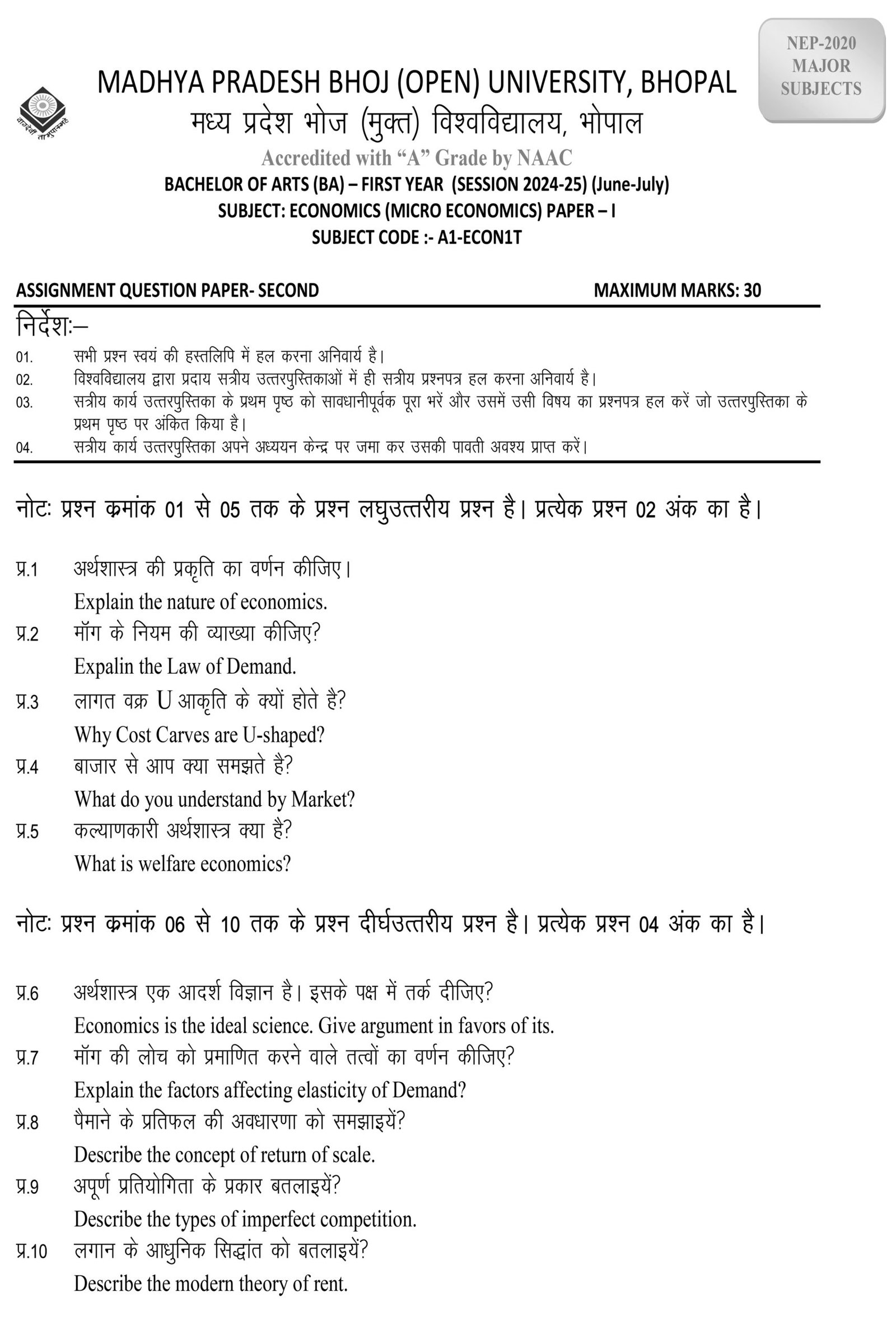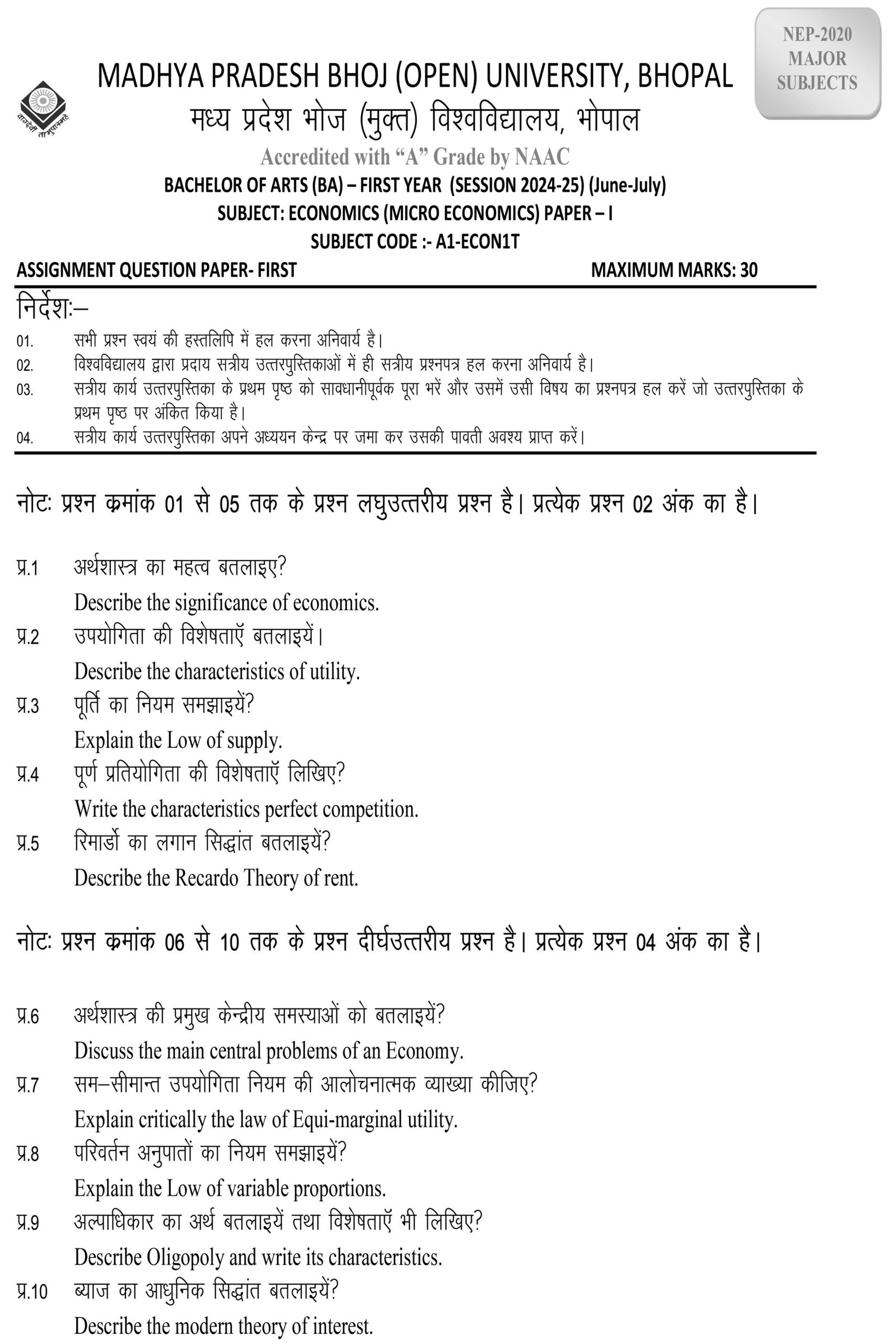विषय – अर्थशास्त्र (व्यष्टि अर्थशास्त्र) — पेपर प्रथम